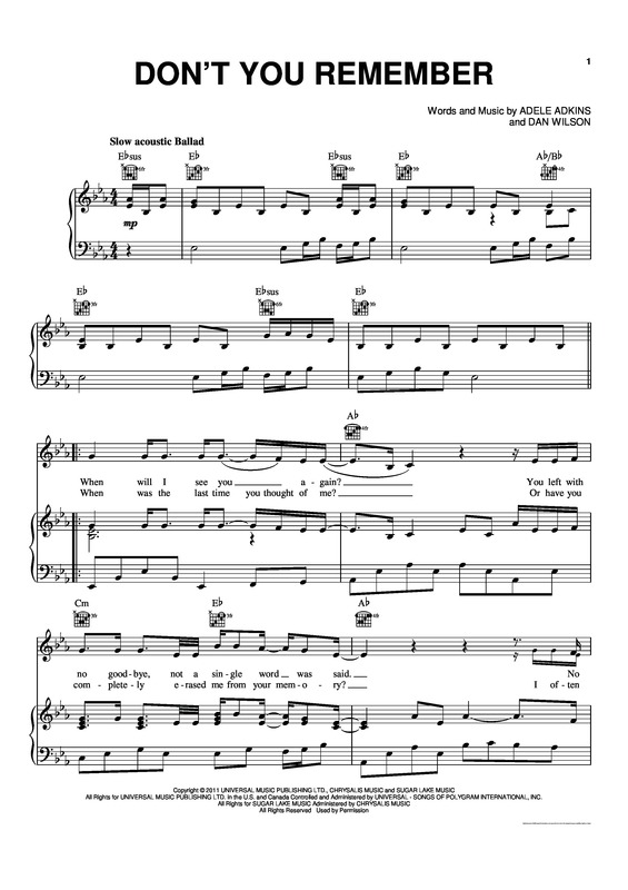 G d d/f# g the reason you loved me.before, em a g baby, please remember me once more. Starts in d major in 4/4 time at ~ 60 bpm (♩) key signatures: D d d d d d/f# g when will i see you.again? Bm you left with no goodbye, d d/f# g not a single word was said, d d/f# g no final kiss to seal any sins, bm d d/f# g i had no idea of the state we were in, *) a i know i have a fickle heart and bitterness, bm and a wandering eye f# a and a heaviness in my head. G d g the reason you loved me before, em a g baby, please remember me once more, a# f gave you the space so you could breathe, c g i kept my distance so you would be free, a# dm and hope that you find the missing piece, em a to bring you back to me, e g# a why don't you remember? Bm you left with no goodbye d g not a single word was said d d/f# g no final kiss to seal any sins bm d g i had no idea of the state we were in. Em a d don't you remember.? F#madd6 |244232| (you could also play f#m oder f#m7 instead) g#madd6 |466454| (you could also play g#m oder g#m7 instead) or: Please subscribe to the acousticlub channel here: Kunci gitar dan lirik lagu adele dont you remember intro: